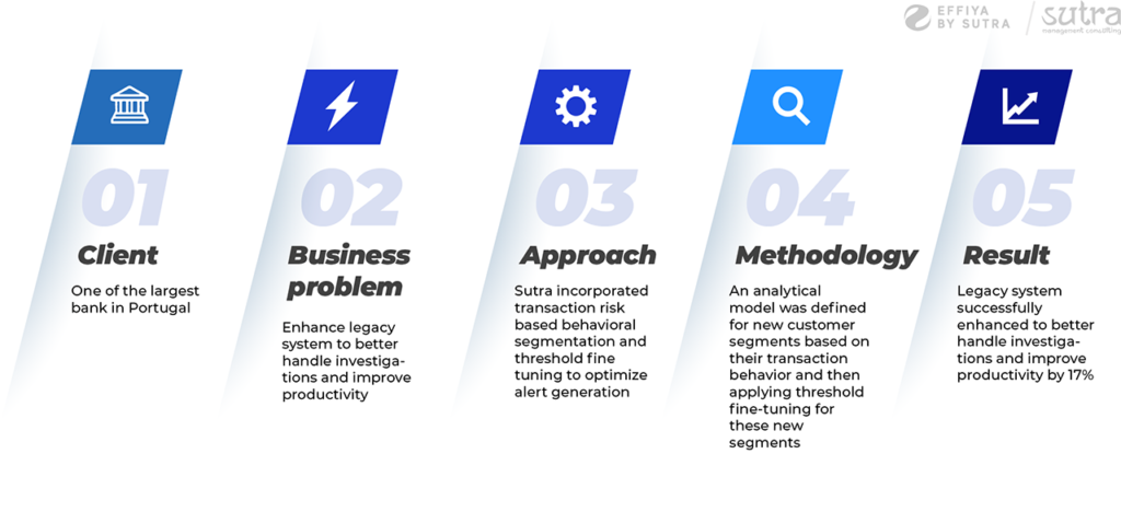 Sutra improved the productivity rate of alerts for one of the largest bank in Portugal and further reduced false positives by ~ 17% while capturing 100% of SAR customers.